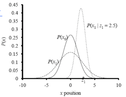 As demonstrated in the figure below, given prior belief $P(X_0)$, our estimate of $P(X_1)$ without an observation has the same mean and larger variance as shown by the first two lines in equations above. However, given an observation of $2.5$, the new estimated distribution shifted to the right accoding to last three lines of equations above.