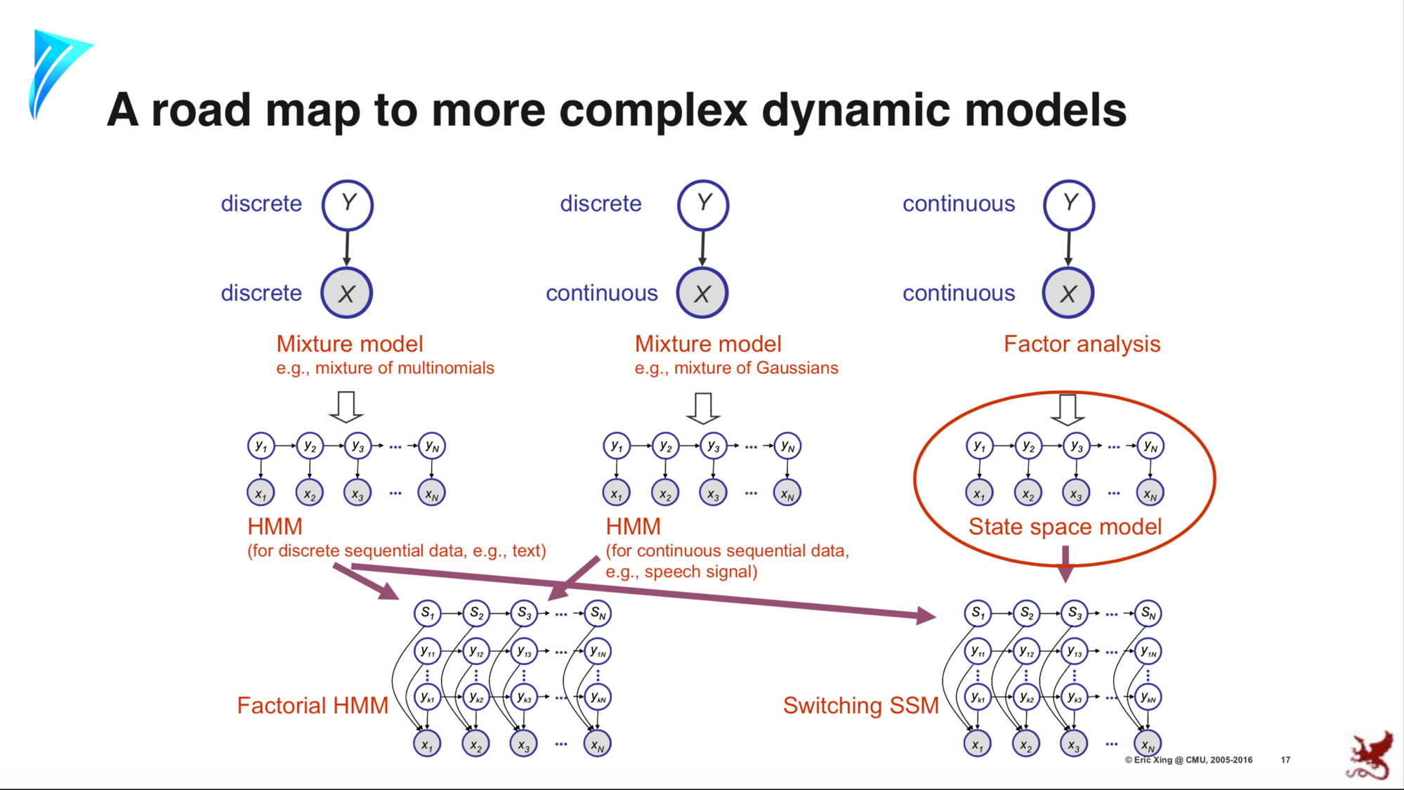 In the figure above, the dynamical (sequential) continuous counterpart to HMMs are the State Space Models (SSM). In fact, they are the sequential extensions of Factor Analysis discussed so far. SSM can be thought of as a sequential Factor Analysis or continuous state HMM.